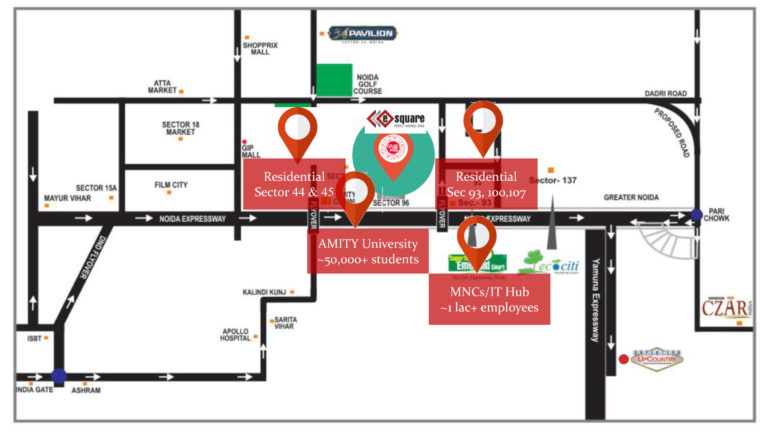 The project Supertech E Square is designed with modern structure oriented with unique features and specifications and enhances the innovative architectural design. Supertech E square is already completed and glass facade work is going on. As per new Layout of Supertech Esquare Project on lower ground floor, upper ground floor, and Ground Floor we are having retail shops and restaurant. On third floor in supertech esquare virtual food court is planned. From 4th floor to 30th floor we are having office spaces ranging from 400 sq ft to 2000 sq ft.